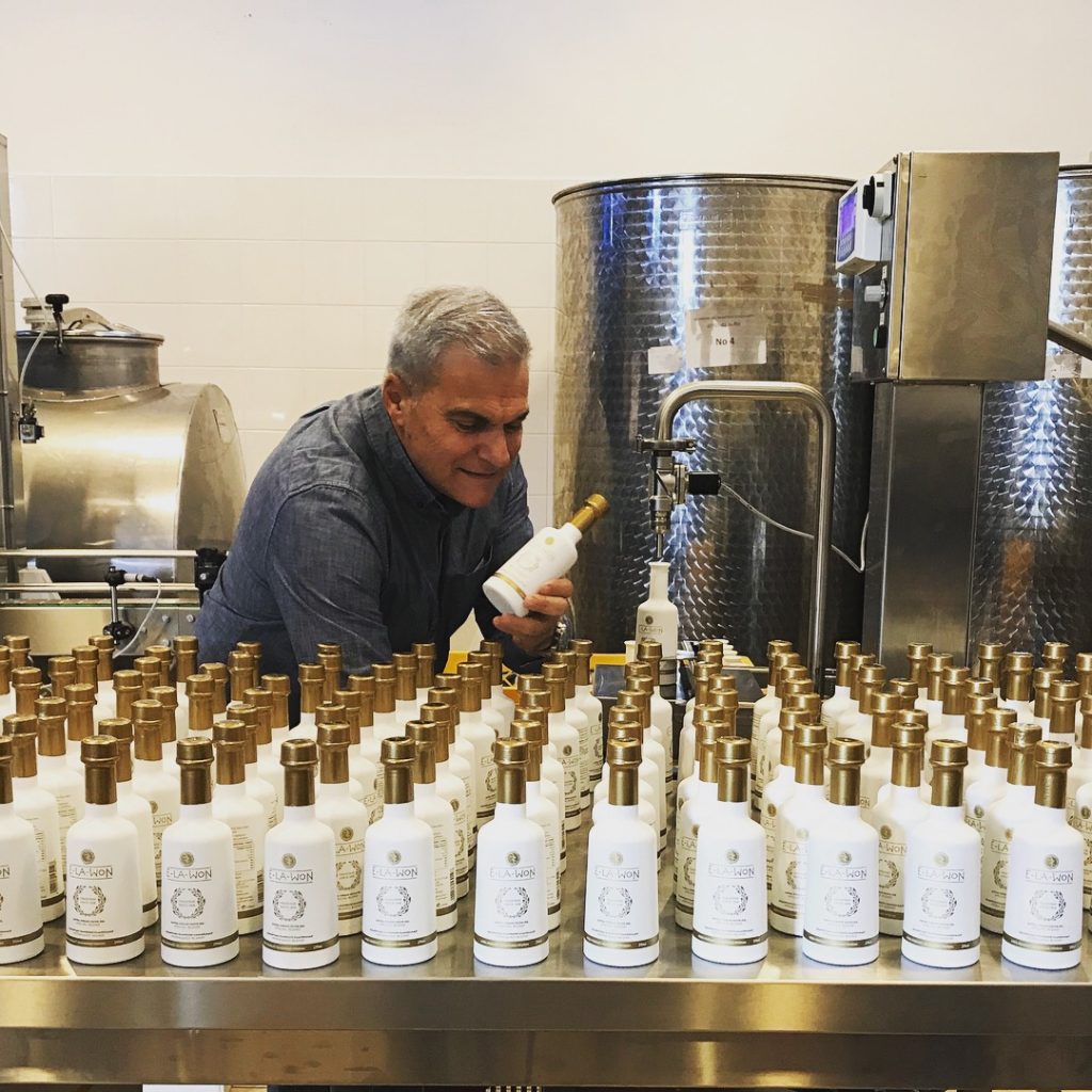 Κάπως έτσι, χτίζοντας εκ του μηδενός, δημιούργησε τον δικό του ελαιώνα ανάμεσα στο Κιάτο και το Ξυλόκαστρο και φύτεψε τα πρώτα του λιόδεντρα, ποικιλίας Κορωνέικης και Πατρινής, αγορασμένα από την περιοχή Φίχτια των Μυκηνών. Η ενασχόλησή του με τις ελιές ξεκινά από την δεκαετία του 1990, όμως η E-LA-WON πήρε σάρκα και οστά τον Οκτώβριο του 2014. Σήμερα, η E-LA-WON παράγει το δικό της καθαρό λάδι σε συγκεκριμένες ποσότητες και με ανεπιτήδευτο τρόπο, χωρίς προσθήκες και προσμείξεις – ακριβώς όπως παλιά – ακολουθώντας τις σύγχρονες επιταγές που προσβλέπουν στη διαφύλαξη του περιβάλλοντος και την αειφορία.