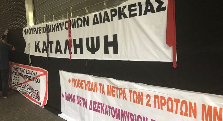 Στο κεντρικό πανό της ΠΟΕΔΗΝ αναγράφεται « υπουργείο μνημονίων διαρκείας- κατάληψη» ενώ πάνω από το πανό έχουν τοποθετηθεί κρεμασμένες γραβάτες, παραπέμπομτας στην κίνηση του πρωθυπουργού να βάλει γραβάτα στην εκδήλωση του Ζαππείου.
