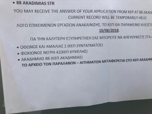 Από τις πρώτες πρωινές ώρες έχουν περάσει έξω από το ΚΕΠ εκατοντάδες πολίτες που βρήκαν κατεβασμένα ρολά και ανακοινώσεις, που ενημερώνουν ότι το ΚΕΠ θα παραμείνει κλειστό έως στις 10 Αυγούστου και πως οι πολίτες για την καλύτερη εξυπηρέτηση τους μπορούν να απευθύνονται στα ακόλουθα ΚΕΠ :