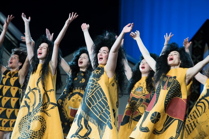 Νάντια Κοντογεώργη (1η γυναίκα), Μαρία Κατσανδρή (2η γυναίκα), Αντρη Θεοδότου (3η γυναίκα), Ελένη Ουζουνίδου (Κηρύκαινα), Βαλέρια Δημητριάδου, Ειρήνη Μακρή, Κατερίνα Μαούτσου, Ιριδα Μάρα, Φραγκίσκη Μουστάκη,Ελένη Μπούκλη, Ηλέκτρα Σαρρή, Νατάσα Σφενδυλάκη, Αντιγόνη Φρυδά.