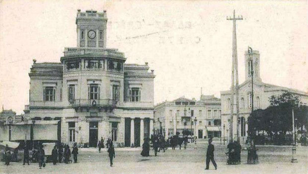 Η ιστορία του ξεκινά τον Αύγουστο του 1869, όταν σε απόσταση αναπνοής από το λιμάνι και απέναντι από την εκκλησία της Αγίας Τριάδας θεμελιώνεται ένα κτίριο για να στεγαστεί το πρώτο χρηματιστήριο εμπορευμάτων της χώρας. Στο ισόγειο υπήρχε μία μεγάλη αίθουσα, όπου γίνονταν οι συναλλαγές και κλείνονταν οι συμφωνίες. Στον πρώτο όροφο ήταν τα γραφεία. Στον πύργο του κτηρίου, ο τότε Δήμαρχος Πειραιά, Δημήτρης Μουτζόπουλος, τοποθέτησε το «Ωρολόγιον της Πόλεως» σε σχέδια του αντισυνταγματάρχη Γ. Μεταξά και με κατασκευαστή τον εργολάβο, Παναγιώτη Κύπριο. Το χρηματιστήριο όμως, σύμφωνα με τις μαρτυρίες, λειτούργησε μόλις ένα χρόνο εξαιτίας μίας περίεργης απόφασης.