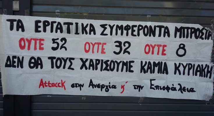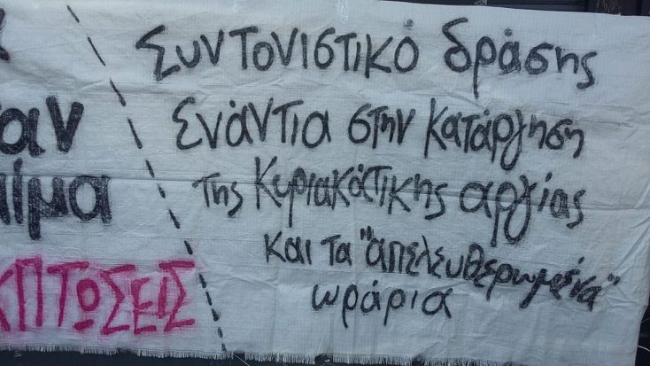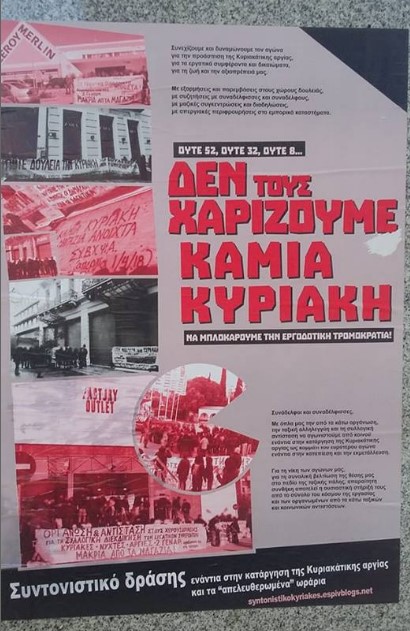 «Το Μάη του 2017 ψηφίστηκε ο νόμος για άνοιγμα των εμπορικών καταστημάτων 32 Κυριακές το χρόνο σε «τουριστικές ζώνες» της χώρας. Η κατάργηση της Κυριακάτικης αργίας είναι κομμάτι της επίθεσης των αφεντικών ενάντια στο σύνολο των εργαζομένων» αναφέρεται μεταξύ άλλων σε ένα από τα κείμενα που μοιράζουν οι συγκεντρωμένοι.