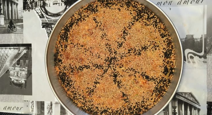 Λαδώνουμε ένα ταψάκι, ρίχνουμε μέσα τον χυλό, πασπαλίζουμε με λίγο καλαμποκάλευρο και βάζουμε σιγά σιγά την γέμιση με το λάχανο, πασπαλίζουμε την επιφάνεια με το καλαμποκάλευρο που περίσσεψε, ραντίζουμε με λίγο λάδι, νερό και σουσάμι η παπαρουνόσπορο και ψήνουμε σε προθερμασμένο φούρνο στους 180 βαθμούς για μια ώρα περίπου.