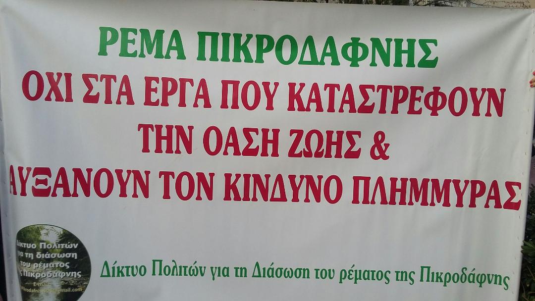 Οι κάτοικοι επισημαίνουν, επίσης, ότι τμήμα της Πικροδάφνης από την Ηλιούπολη μέχρι το βουνό έχει εγκιβωτιστεί και έχει μετατραπεί σε κλειστό οχετό, ο οποίος έχει χτιστεί. Πράγμα που σημαίνει ότι το νερό, σε περίπτωση ακραίας βροχόπτωσης, δεν έχει είσοδο προς την Πικροδάφνη.