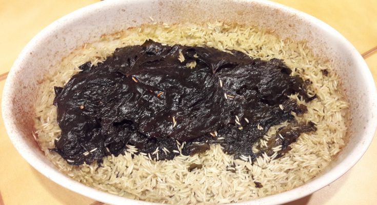 Σημείωση: Το νεράκι που ζεματίσαμε τα φύλλα δίνει μια ιδιαίτερη γεύση στο ρύζι, γι αυτό βάλτε λίγο περισσότερο να σας φτάσει.