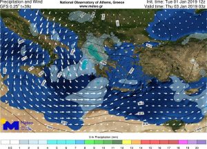 Οι χιονοπτώσεις θα είναι κατά τόπους ισχυρές στην Εύβοια, Κεντρική Μακεδονία, Ανατολική Θεσσαλία και Ανατολική και Κεντρική Στερεά, ενώ χιονοπτώσεις αναμένονται και στην πόλη της Θεσσαλονίκης κατά τη διάρκεια της Πέμπτης 3 Ιανουαρίου 2019.