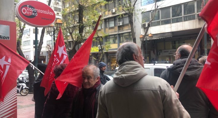 Παράσταση διαμαρτυρίας πραγματοποιούν σε συμβολαιογραφείο, επί της οδού Ακαδημίας 85, μέλη της Λαϊκής Ενότητας.