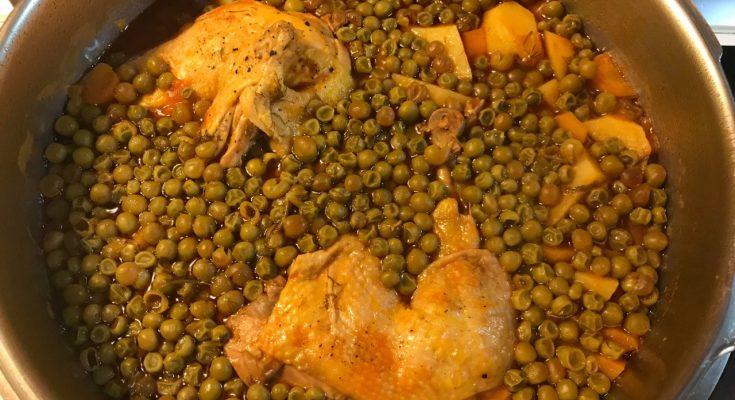 Στην σάλτσα που έχει γίνει από το βράσιμο του κόκορα, ρίχνουμε τον αρακά, συμπληρώνουμε λίγο νεράκι ακόμη αν χρειαστεί και περιμένουμε σχεδόν να γίνει, τότε ρίχνουμε μέσα και το κοτόπουλο για να πάρουν όλα μαζί μια βράση.
