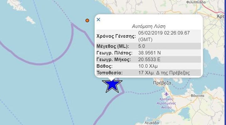 Σεισμική δόνηση 5,2 βαθμών της κλίμακας Ρίχτερ καταγράφηκε στις 04:26 στον θαλάσσιο χώρο 14 χιλιόμετρα δυτικά-βορειοδυτικά της Πρέβεζας και 294 χιλιόμετρα δυτικά-βορειοδυτικά της Αθήνας, ανακοίνωσε το Γεωδυναμικό Ινστιτούτο του Εθνικού Αστεροσκοπείου Αθηνών.
