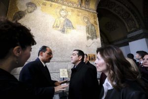 Ο πρωθυπουργός ξεναγήθηκε στην Αγία Σοφία συνοδευόμενος από τον υπουργό Παιδείας Κώστα Γαβρόγλου, τον αναπληρωτή υπουργό Εξωτερικών Γιώργο Κατρούγκαλο, τον υφυπουργό Εξωτερικών Μ. Μπόλαρη και τη σύντροφό του Μπέτυ Μπαζιάνα.