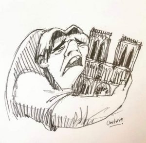 Viral έχει γίνει ένα συγκινητικό σκίτσο που δείχνει τον Κουασιμόδο να κρατάει δακρυσμένος στην αγκαλιά του την Παναγία των Παρισίων.