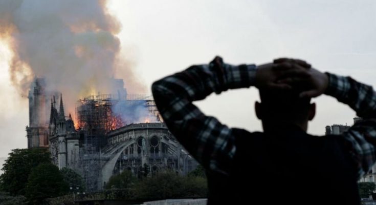 Στάχτες πέφτουν πάνω στο πλήθος, ενώ ακούγονται οι σειρήνες των περιπολικών και των πυροσβεστικών οχημάτων. Κάποιοι τραβούν φωτογραφίες, άλλοι περιγράφουν από το τηλέφωνο στους φίλους τους τον κιτρινόμαυρο καπνό, τις στάχτες, την απόγνωση, τη θλίψη. «Είναι χιλίων ετών», εξηγεί ένας άνδρας στη 10χρονη κόρη του.