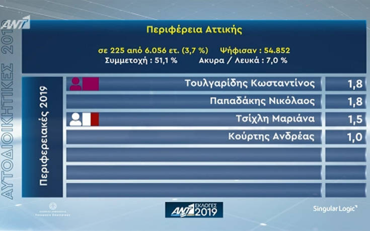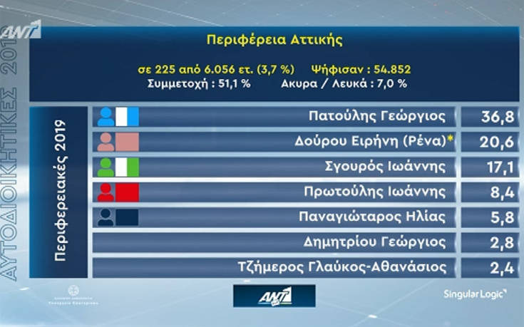 Όπως προκύπτει από τα πρώτα αποτελέσματα, ο Γιώργος Πατούλης συγκεντρώνει 36,8%, η Ρένα Δούρου 20,6% και ο Γιάννης Σγουρός 17,1%.