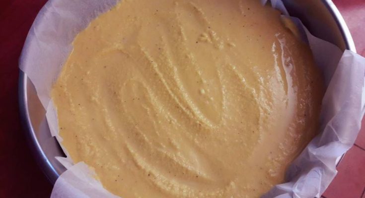 Στρώνουμε στο ταψί που θα χρησιμοποιήσουμε λαδόκολλα που την λαδώνουμε και ρίχνουμε επάνω τον χυλό μας, τρίβουμε λίγο πιπέρι και βάζουμε από πάνω την τριμμένη φέτα, να σκεπαστεί παντού και την βάζουμε στον φούρνο στους 180 βαθμούς πάνω κάτω, για μισή ώρα.