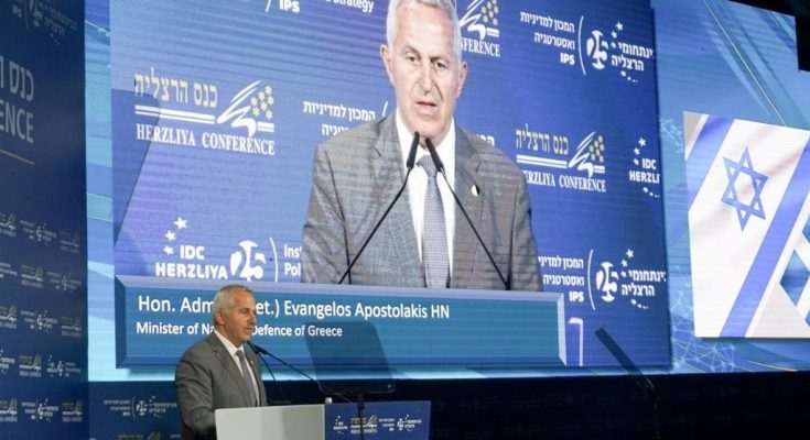 «Η προβληματική στάση της Τουρκίας, εκφραζόμενη μέσω αθεμελίωτων ισχυρισμών που αγνοούν τα εθνικά κυριαρχικά μας δικαιώματα, απειλεί τη σταθερότητα ολόκληρης της περιοχής», είπε ο ΥΕΘΑ Β. Αποστολάκης, σε ομιλία του στην πόλη Herzliya του Ισραήλ, ως κεντρικός ομιλητής, στο 19ο ετήσιο συνέδριο Herzliya Conference.