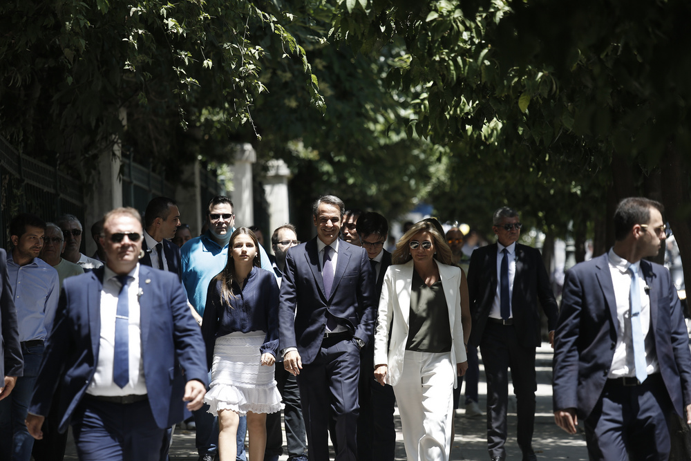Λίγο πριν τις 13:00 ο Κυριάκος Μητσοτάκης συνοδεύμενος από τη σύζυγό του και τα τρία παιδιά του, πέρασε την πόρτα του Προεδρικού Μεγάρου, ώστε να ορκιστεί πρωθυπουργός. Τον νέο πρωθυπουργό όρκισε ο αρχιεπίσκοπος Αθηνών και Πάσης Ελλάδος, κ. Ιερώνυμος. Παρούσες ήταν και οι τρεις αδελφές του προέδρου της ΝΔ.
