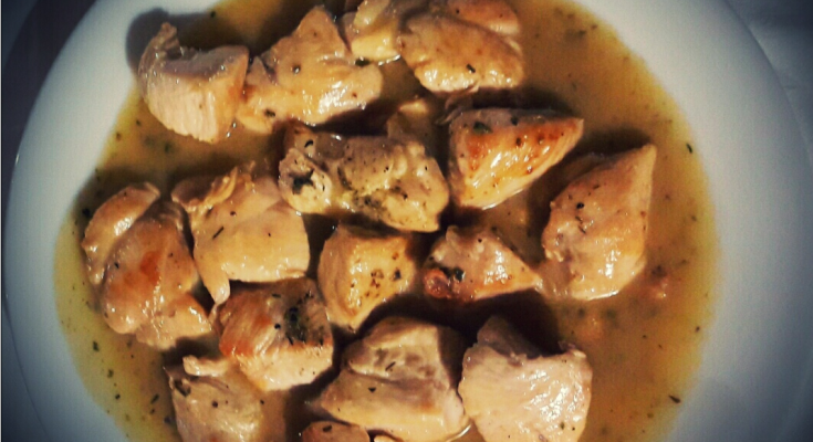 Μόλις τσιγαριστεί απ’ όλες τις πλευρές ρίχνουμε το κρεμμύδι περασμένο από το μούλτι, και το γυρνάμε και μαζί του, μετά το σβήνουμε με το κρασί, αλατοπιπερώνουμε, ρίχνουμε και τον κύβο μυρωδικών την ρίγανη, λίγο νεράκι για να το βοηθήσουμε να βράσει, δεν θέλει πολύ ώρα, σαν το κοτόπουλο κι αυτό και όταν βράσει και μείνει με την σάλτσα του είναι έτοιμο.