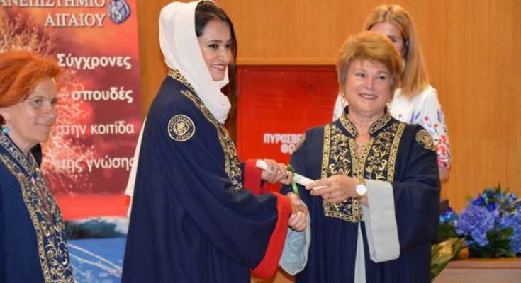 Το Πανεπιστήμιο Αιγαίου αναγόρευσε την Aysha Mohammed Saeed Fadila Alhameli σε Επίτιμη Διδακτόρα του Τμήματος Οικονομικής και Διοίκησης Τουρισμού της Σχολής Επιστημών της Διοίκησης.