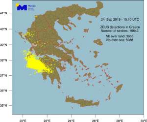 Το σύστημα καταγραφής κεραυνών «ΖΕΥΣ» του Εθνικού Αστεροσκοπείου Αθηνών κατέγραψε πάνω από 10.500 κεραυνούς έως τις 13:00, εκ των οποίων περίπου 7.000 πάνω από την θάλασσα και 3.500 πάνω από την ξηρά. Στο χάρτη που ακολουθεί παρουσιάζεται η γεωγραφική κατανομή τους.
