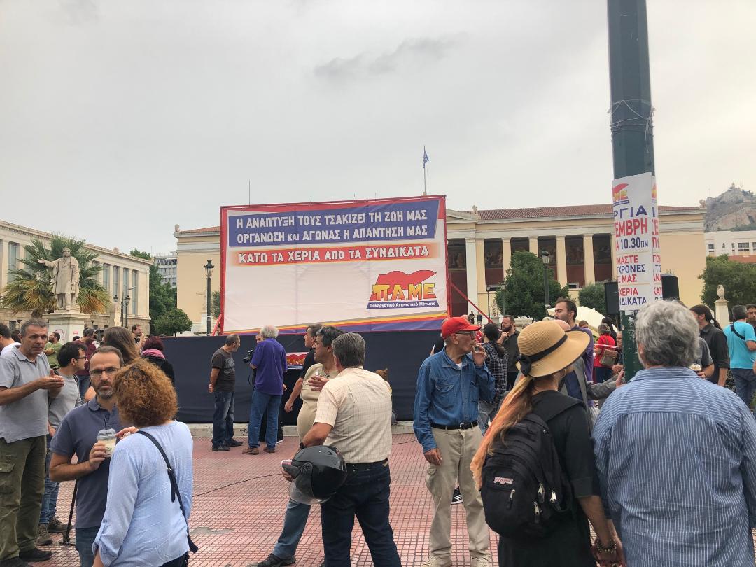 Με το σύνθημα «κάτω τα χέρια από τα συνδικάτα» μέλη του ΠΑΜΕ, ζητούν απόσυρση του πολυνομοσχεδίου που εισάγει μεταξύ άλλων την ηλεκτρονική ψηφοφορία για την διεξαγωγή απεργίας και ρυθμίζει θέματα που έχουν να κάνουν με τος συλλογικές συμβάσεις εργασίας.