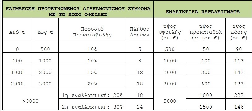 · Ο οφειλέτης θα μπορεί εύκολα και γρήγορα από το σπίτι του να υπολογίσει , την προκαταβολή και τη μηνιαία δόση του, με βάση τον αναρτημένο πίνακα, ανάλογα με το ύψος του ποσού που οφείλει.