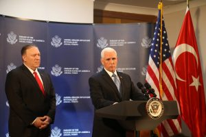 Σε συμφωνία κατάπαυσης του πυρός για 120 ώρες στη Βόρεια Συρία με διακοπή της τουρκικής στρατιωτικής επιχείρησης «Πηγή Ειρήνης» κατέληξαν ΗΠΑ και Τουρκία, μετά την δίωρη συνάντηση ποου είχαν στην Άσκτυρα ο Τούρκος Πρόεδρος Ταγίπ Ερντογάν και ο Αμερικανός Αντιπρόεδρος Μάικλ Πένς.