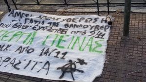 Έξω από το κτήριο της ΑΣΟΕΕ έχει ξεκινήσει από χθες το βράδυ απεργία πείνας μια 23χρονη διαμαρτυρόμενη για δυο γατάκια που βρίσκονται εδώ και μέρες εγκλωβισμένα στο εκκενωμένο πλέον κτήριο της πρώην κατάληψης Βανκούβερ, μιας και οι είσοδοι έχουν σφραγιστεί απο τις προηγούμενες μέρες με τσιμεντόλιθους από την Αστυνομία.