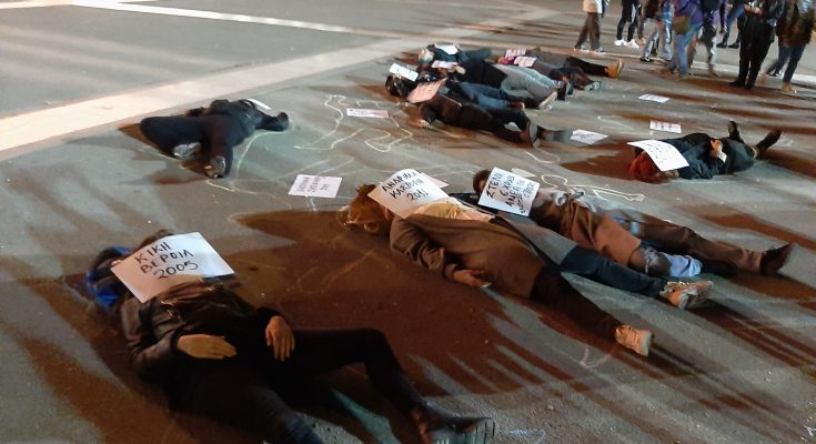 Παράλληλα, μπροστά στη Βουλή, μέλη της φεμινιστικής συλλογικότητας «Καμία Ανοχή», έχουν ξαπλώσει πάνω σε περιγράμματα ανθρώπινων σωμάτων, αναπαραστώντας έτσι θύματα της έμφυλης και οικογενειακής βίας, την ίδια στιγμή που κρατούν πλακάτ με γυναικεία ονόματα-θύματα.
