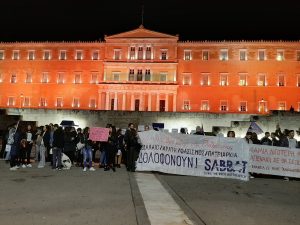 Η οπορεία έφτασε στη Βουλή, η οποία έχει πορτοκαλί χρώμα για χάριν της ημέρας, γύρω στις 7:15 το απόγευμα με συμμετοχη περιπου 500 ατομων, ενώ είχε προηγηθεί προσυγκέντρωση από τις 6 στην πλατεία Κλαυθμώνος.
