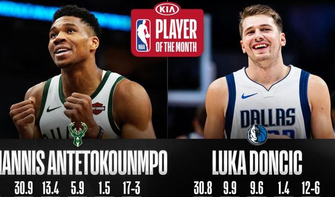 Οι Γιάννης Αντετοκούνμπο και Λούκα Ντόντσιτς, με τις καταπληκτικές τους επιδόσεις, αναδείχθηκαν παίκτες του μήνα σε Ανατολή και Δύση αντίστοιχα.