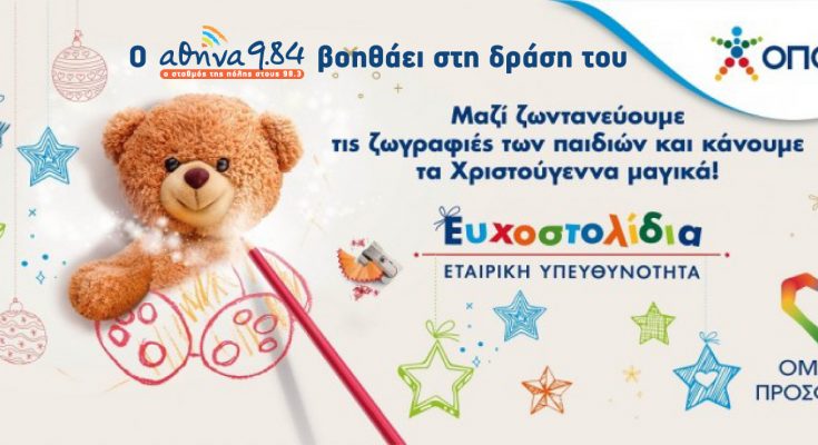 Στο πνεύμα των Χριστουγέννων κινείται -για πρώτη φορά- φέτος ο Αθήνα 9.84. Με ομόφωνη απόφαση του ΔΣ στηρίζει τη μεγάλη γιορτή προσφοράς και αγάπης που πραγματοποιεί για έκτη συνεχή χρονιά ο ΟΠΑΠ .Μας καλεί να επιλέξουμε τα «Ευχοστολίδια» για να κάνουμε πραγματικότητα τις ζωγραφιές–χριστουγεννιάτικες ευχές των παιδιών από τον οργανισμό «Το Χαμόγελο του Παιδιού», την Ένωση «Μαζί για το Παιδί», τα Παιδικά Χωριά SOS και το Ίδρυμα Γεωργίου και Αικατερίνης Χατζηκώνστα.