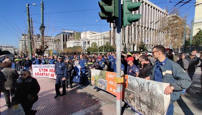 Συγκέντρωση έξω από τη Βουλή στη Βασιλίσσης Σοφίας πραγματοποιούν συμβασιούχοι και πενταετούς θητείας πυροσβέστες διαμαρτυρόμενοι για διατάξεις που περιλαμβάνονται στο νομοσχέδιο για την αναδιοργάνωση της πολιτικής προστασίας.