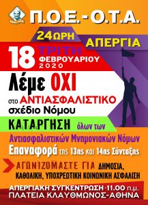 Εικοσιτετράωρη πανελλαδική απεργία πραγματοποιεί την Τρίτη 18 Φεβρουαρίου η ΠΟΕ – ΟΤΑ, αντιδρώντας στο σχέδιο νόμου για το ασφαλιστικό. Στις 11 το πρωί της ίδιας ημέρας διοργανώνει συγκέντρωση στην πλατεία Κλαυθμώνος.