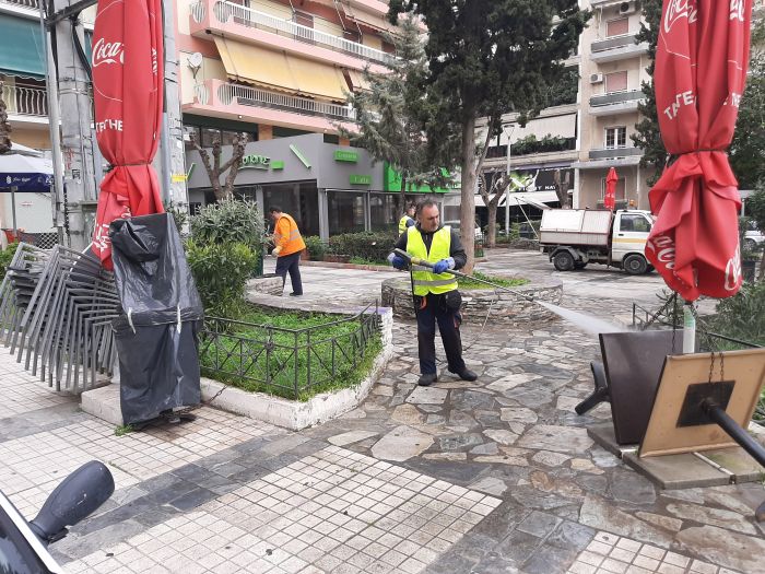 Επιχείρηση καθαρισμού και απολύμανσης από τα συνεργεία καθαρισμού του δήμου στην πλατεία Ηούς που ανήκει στην 3η δημοτική κοινότητα και βρίσκεται στην περιοχή των Κάτω Πετραλώνων.