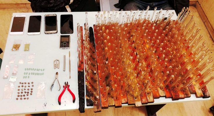 Στην κατοχή τους βρέθηκαν επίσης 332 γυάλινοι δοκιμαστικοί σωλήνες, οι οποίοι χρησιμοποιούνται ως συσκευή για χρήση εισπνεόμενων ναρκωτικών ουσιών καθώς και 5 συσκευές κινητών τηλεφώνων