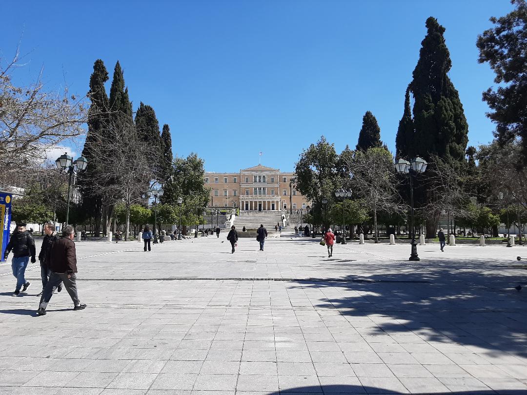 Η ίδια έρημη εικόνα και μπροστά από τη Βουλή, όπου συνήθως τουρίστες και μη συγκεντρώνονται για να φωτογραφήσουν είτε την αλλαγή φρουράς, είτε το Κοινοβούλιο.