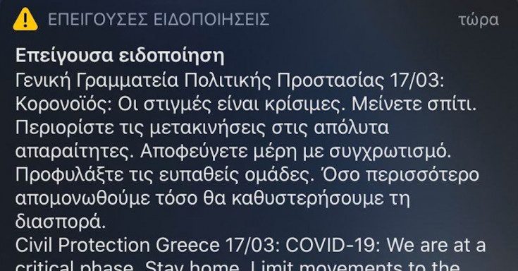 Αναλυτικά, το μήνυμα που είναι γραμμένο στα ελληνικά και στα αγγλικά, αναφέρει: «Γενική Γραμματεία Πολιτικής Προστασίας 17/03: Κορονοϊός: Οι στιγμές είναι κρίσιμες. Μείνετε σπίτι. Περιορίστε τις μετακινήσεις στις απόλυτα απαραίτητες. Αποφεύγετε μέρη με συγχρωτισμό. Προφυλάξτε τις ευπαθείς ομάδες. Όσο περισσότερο απομονωθούμε τόσο θα καθυστερήσουμε την διασπορά».