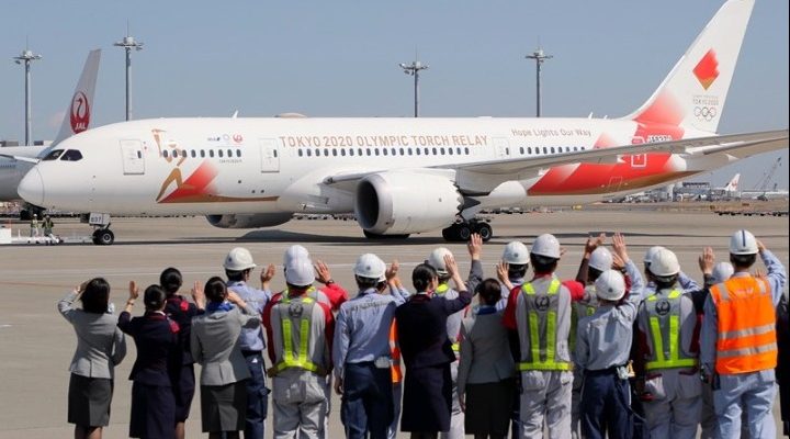 Αεροσκάφος με αποχρώσεις του Τόκιο 2020, αλλά χωρίς επιβάτες, απογειώθηκε την Τετάρτη από το διεθνές αεροδρόμιο Χανέντα για να μεταφέρει πίσω στην Ιαπωνία από την Αθήνα την Ολυμπιακή φλόγα, χωρίς όμως αντιπροσωπεία από τους διοργανωτές, λόγω ανησυχιών για την πανδημία των κορονοϊού.