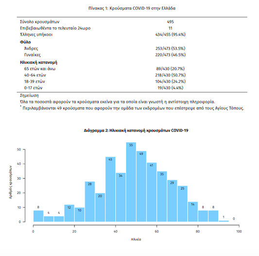Σύμφωνα με τα στοιχεία που περιέχονται σε αυτή, ο αριθμός των κρουσμάτων κορωνοϊού ανέρχεται στα 495, από τα οποία τα 455 αφορούν σε Έλληνες και σε 40 αλλοδαπούς που κατοικούν στη χώρα.
