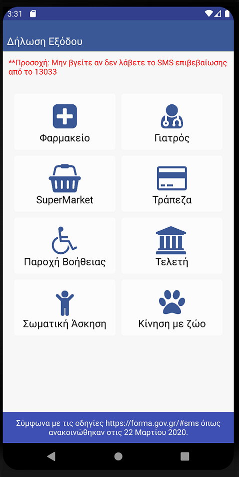 Πρόκειται για μια εφαρμογή για κινητά και τάμπλετ με το όνομα «Μένουμε Σπίτι». Την βρίσκετε στο GooglePlay και απαιτεί Android. Ο χρήστης μπορεί να εξυπηρετείται γρηγορότερα κάθε φορά που επιθυμεί να μετακινείται από το σπίτι του στέλνοντας SMS στο 13033 χωρίς να χρειάζεται να θυμάται τα νούμερα, που αντιστοιχούν στον λόγο μετακίνησης.