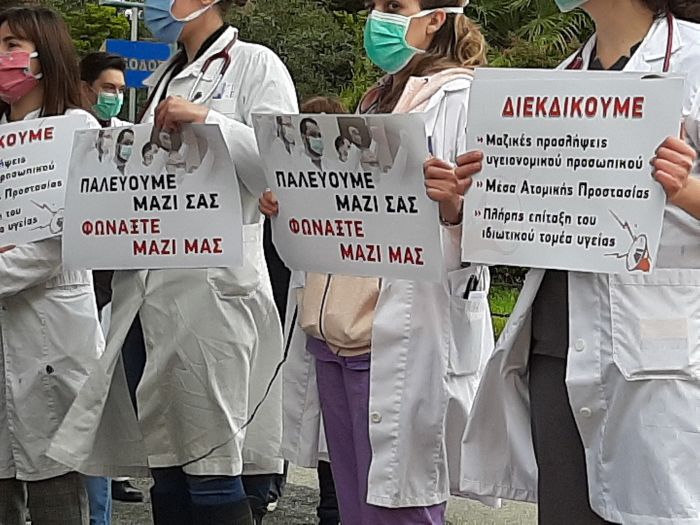 Μεταξύ αυτών και το Γενικό Νοσοκομείο Αθηνών Γεώργιος Γεννηματάς, όπου βρέθηκαν και αλληλέγγυοι, με την αστυνομία, ωστόσο, να μην επιτρέπει να ενωθούν με τους εργαζόμενους του νοσοκομείου που έδιναν τον τόνο της κινητοποίησης. Με συνθήματα όπως «δωρεάν υγεία για όλο το λαό, σε κάθε μετανάστη και ανασφάλιστο», γιατροί και υγειονομικοί ζητούν μόνιμες προσλήψεις στα δημόσια νοσοκομεία καταγγέλλοντας, για μια ακόμη φορά, τεράστιες ελλείψεις σε προσωπικό. Επίσης έκαναν λόγο και για σημαντικές ελλείψεις σε ιατρικό εξοπλισμό. Ενώ ζητούν να διενεργηθούν περισσότερα τεστ για τον κορονοϊό προκειμένου να υπάρχει ξεκάθαρη εικόνα για τον αριθμό των κρουσμάτων. Επισημαίνουν, παράλληλα, πως πρέπει να γίνει πλήρη επίταξη των ιδιωτικών κλινικών και να ανοίξουν όλες οι Μονάδες Εντατικής Θεραπείας (ΜΕΘ).
