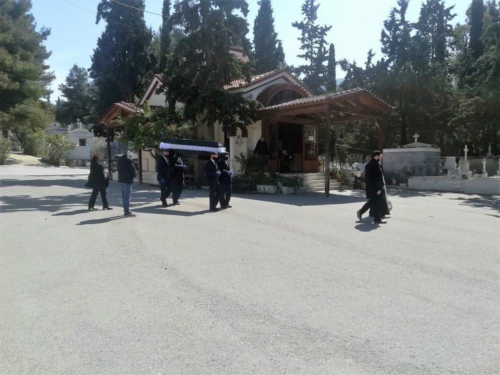 Λιτή τελετή, με έως 5 άτομα στην εκκλησία. Αποστάσεις μεταξύ των συγγενών, ούτε φιλιά, ούτε αγκαλιές ή μια σφικτή χειραψία, που θα δήλωνε το μοίρασμα του πόνου. Δίχως το αποχαιρετιστήριο καφεδάκι ή το καθιερωμένο γεύμα μετά την κηδεία. Το προσωπικό των γραφείων τελετών με μάσκες και γάντια. Ο χώρος του νεκροταφείου άδειος, χωρίς επισκέπτες, πραγματική νεκρόπολη.