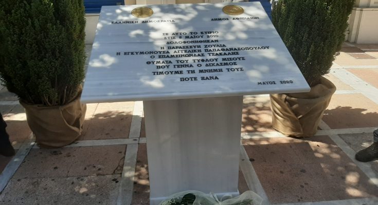 Σε κλίμα συγκίνησης πραγματοποιήθηκε η τελετή αποκαλυπτηρίων της πλακέτας προς τιμήν των θυμάτων της τραγωδίας της Marfin, της Αγγελικής Παπαθανασοπούλου (32 ετών-έγκυος 4 μηνών), του Επαμεινώνδα Τσάκαλη (36 ετών) και της Παρασκευής Ζούλια (35 ετών).